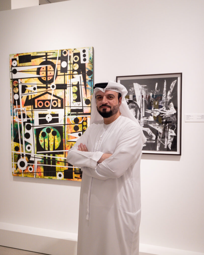 Khalid Al Banna is an Emirati artist whose work blends architectural precision with the emotive power of abstraction. With a background in architecture from Emirates University, he developed a distinct visual language that transforms geometric forms into dynamic compositions.