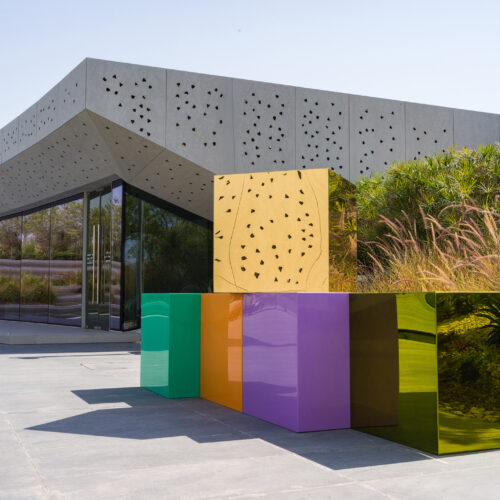 استكشاف للشكل والفراغ، يوازن بين الألوان الجريئة والهدوء المنعكس في البرك المحيطة.